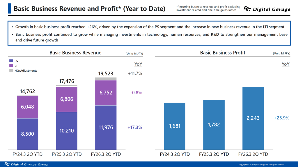 Consolidated profit before tax for the 1H of FY26.3 reached ¥1,416 million. In addition to steady growth in the Platform Solution (PS) and Long-term Incubation (LTI) segments, the rebound from investment valuation losses recorded in the Global Investment Incubation (GII) segment in the same period last year contributed to consolidated profit before tax turning positive.