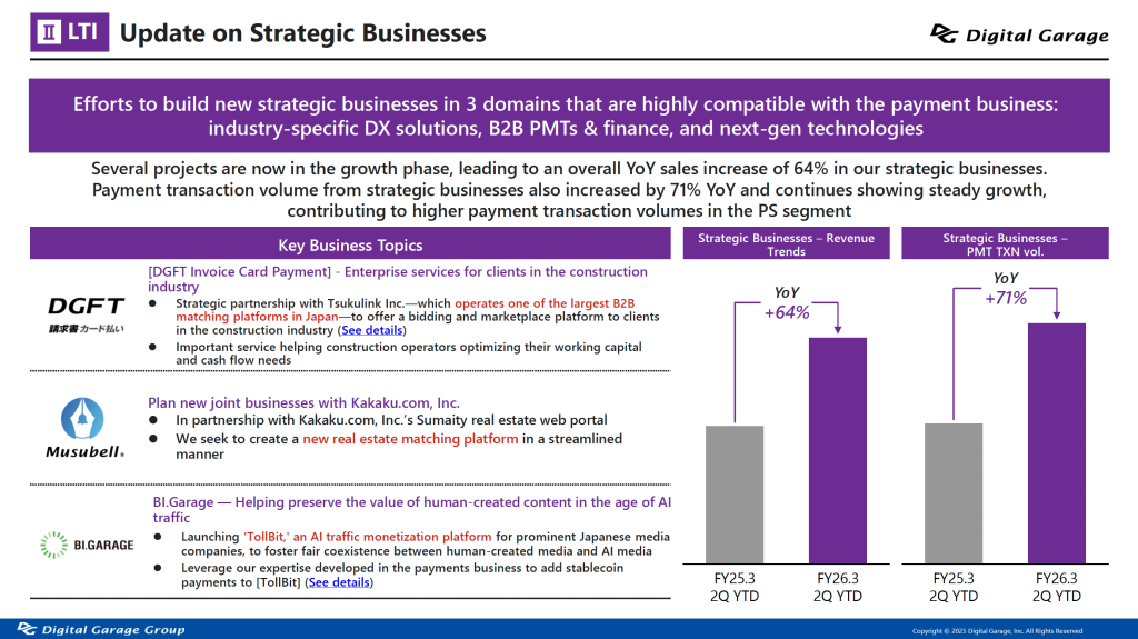 Next, in our group collaboration with Kakaku.com, payment transaction volume continues to expand against the backdrop of one of Japan’s leading traffic volumes. We are also promoting collaborative businesses that combine both companies’ assets, and following the initiative of DGFT’s payment solutions embedded in “Tabelog” inbound reservations, we are working on a collaboration aimed at building a new real estate sales matching platform between Digital Garage’s real estate DX platform “Musubell,” one of Japan’s largest real estate DX platforms, and Kakaku.com’s real estate media “Sumaity.”