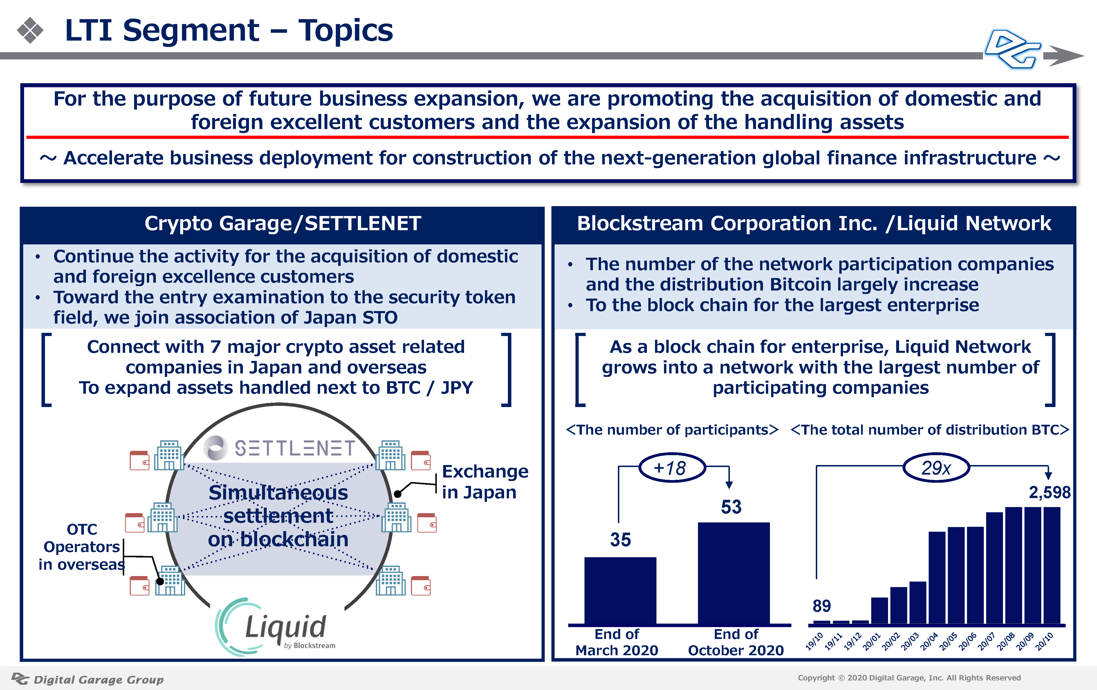 3) Crypto Garage has completed a demonstration as the first project of the FinTech Sandbox of the Cabinet Office. Toward the official commercialization, we have finished system connections with leading crypto assets exchanges both in and outside Japan, and it is finally the countdown phase of the grand opening. In addition, as a related business, demonstration in the STO (Security Token Offering) area will begin.