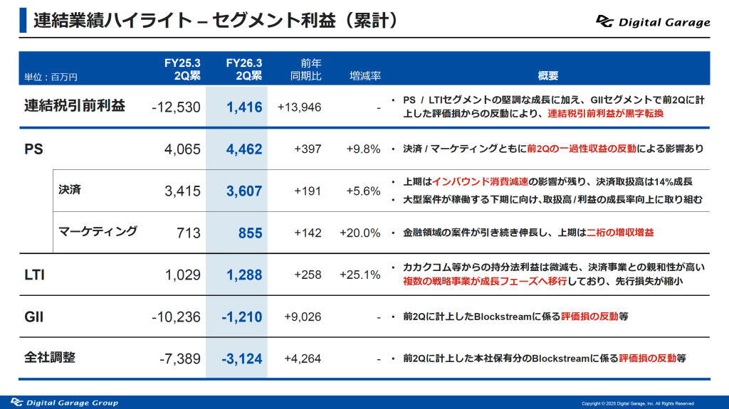 2026年3月期2Q累計の連結税引前利益は、1,416百万円となりました。プラットフォームソリューション(PS)およびロングタームインキュベーション(LTI)セグメントの堅調な成長に加え、グローバル投資インキュベーション(GII)セグメントで前年同期に計上した投資評価損の反動もあり、連結税引前利益が黒字転換しました。
