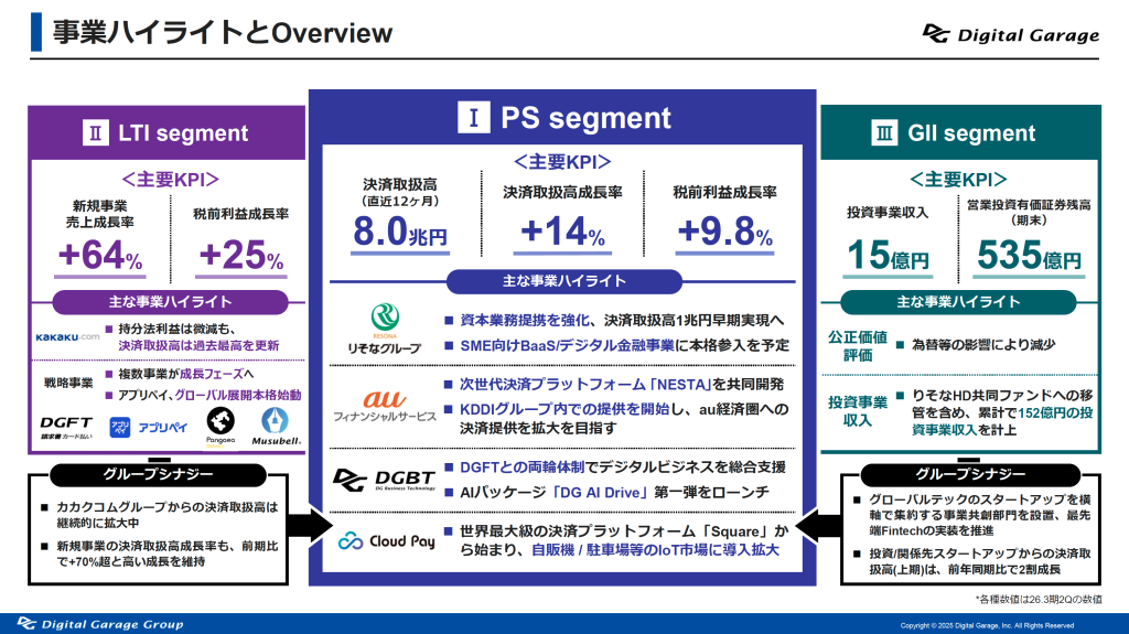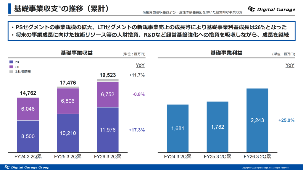 当社グループの事業基盤である決済プラットフォームを軸とした、PSセグメントの2Q(単体)税引前利益は2,257百万円、前年同期比マイナス3%となりました。これは、前年同期の一過性収益の反動を受けたものであり、一過性要素を除いた実質成長率は17%と堅調な成長を維持しています。