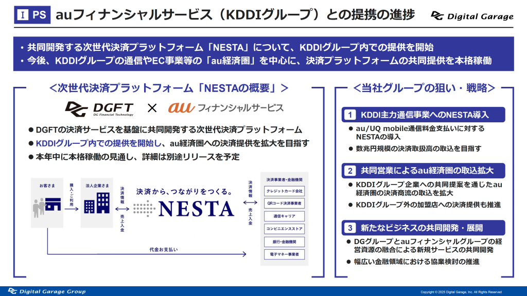 当社とKDDIグループのauフィナンシャルサービス株式会社の業務提携契約締結(2024年5月)以来共同開発を進めてきた、次世代決済プラットフォーム「NESTA」は計画通りに進捗しており、第一弾カットオーバーとして、au/UQ mobile法人契約の通信料金決済への導入プロセスが開始しました。本件事業を通じ、数兆円規模の決済取扱高の取り込みを目指しています。