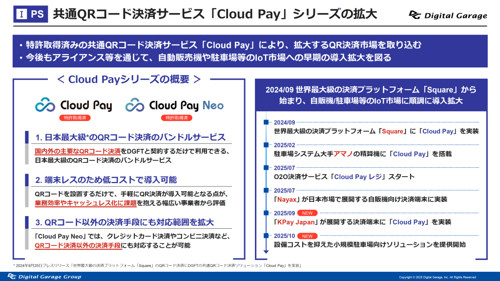 決算サマリーでも触れた通り、DGFTが提供する、日本最大級のQRコード決済バンドルサービス「Cloud Pay」(特許番号:第7303664号)シリーズの導入先が拡大しています。