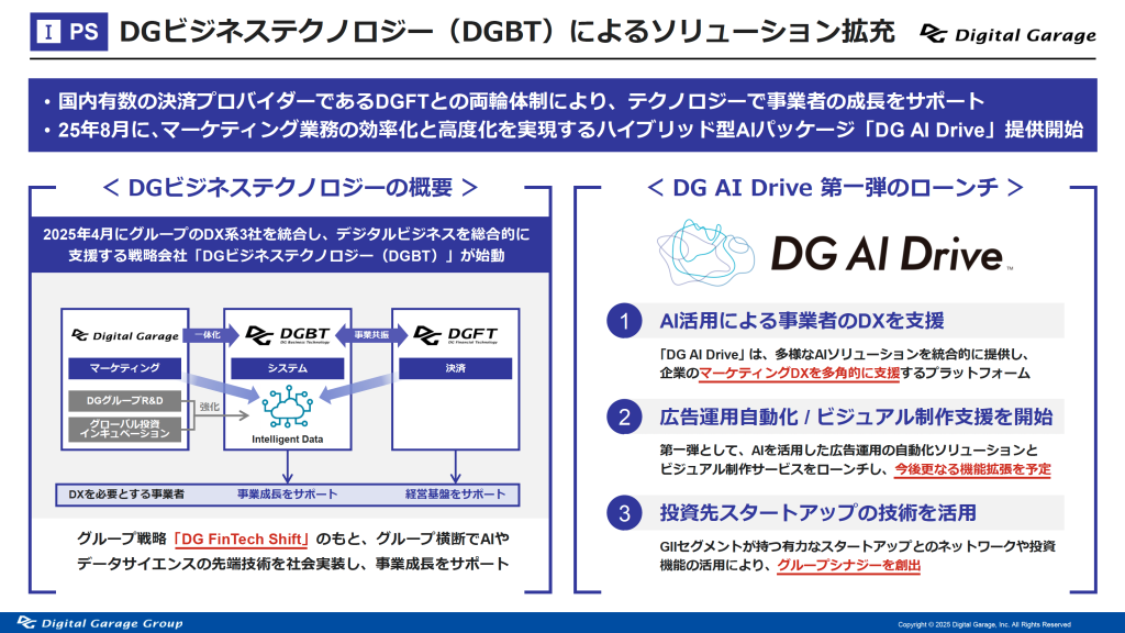 2025年8月には、企業のマーケティング業務を効率化するハイブリッド型AIパッケージ「DG AI Drive」の提供を開始しました。本サービスには、当社GIIセグメントの投資先スタートアップの技術を活用しており、このようなグループシナジーのもと、今後より幅広い企業へ向けたAI活用プラットフォームへと進化させていきます。
