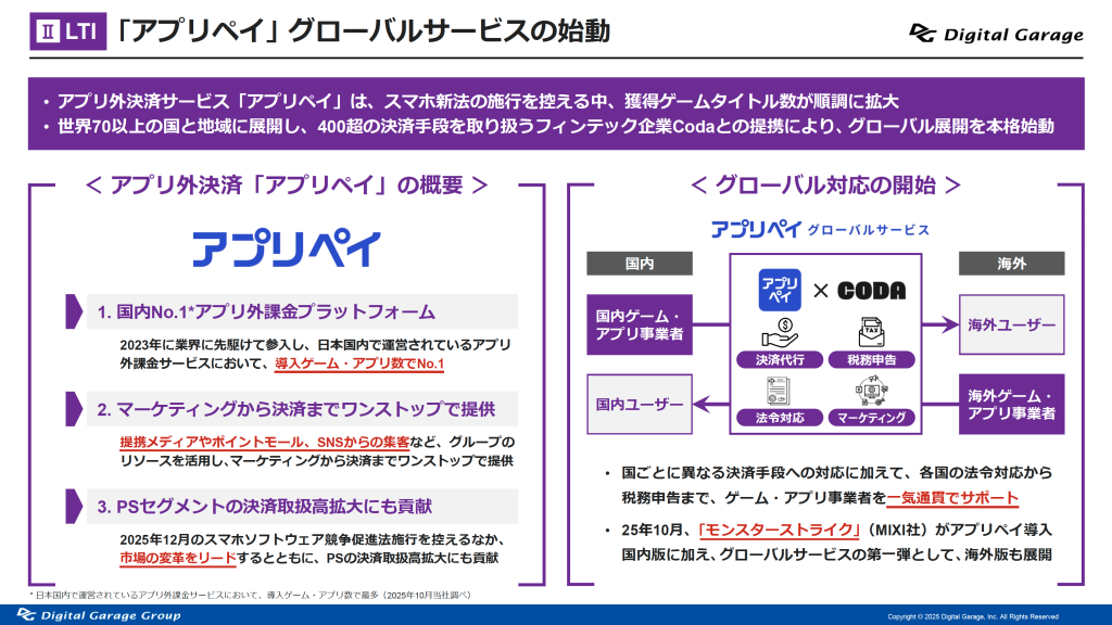 当社が2023年より提供している国内最大級のアプリ外課金プラットフォーム「アプリペイ」が、2025年9月、世界70以上の国・地域に展開するCoda Payments Pte. Ltd.と提携し、グローバル対応を開始しました。