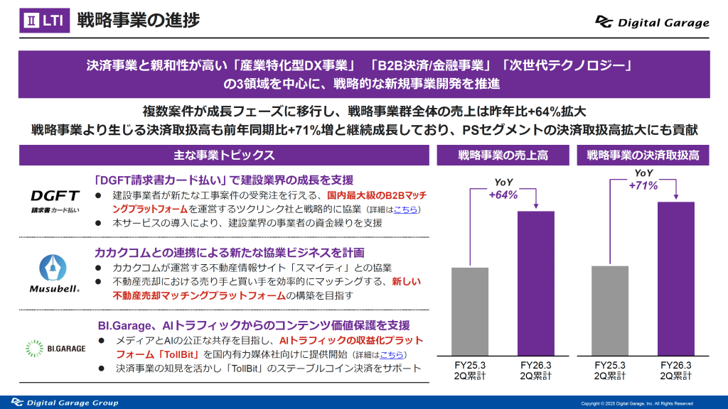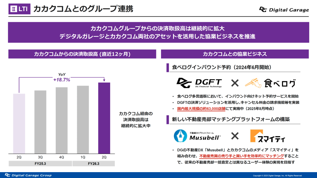 次に、カカクコムとのグループ連携です。日本有数のトラフィックを背景に決済取扱高が引き続き拡大しています。また、両社のアセットを融合した協業ビジネスを推進しており、DGFTの決済ソリューションと食べログインバウンド予約の取り組みに続き、国内最大級の不動産DXプラットフォーム「Musubell」とカカクコムの不動産メディア「スマイティ」において、新たな不動産売却マッチングプラットフォームの構築を目的とした協業に取り組んでいます。