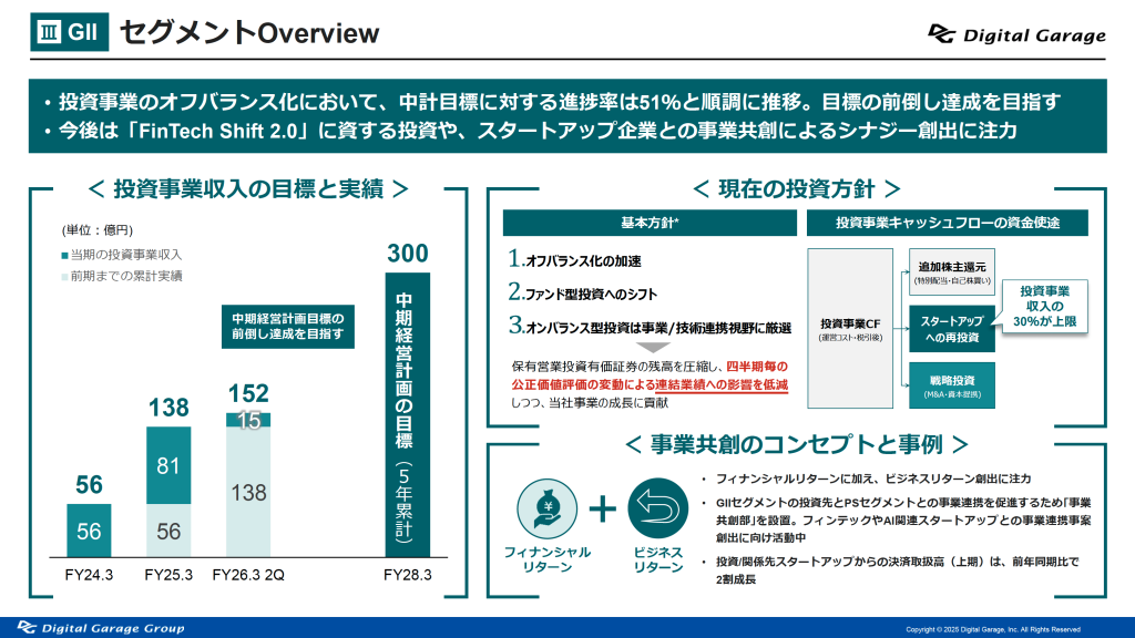 GIIセグメントは、投資ポートフォリオの売却、オフバランス化を継続して推進しています。これにより中計5ヶ年KPIである「投資事業収入300億円」に対する進捗率は51%と加速しています。また、投資先スタートアップとの連携による事業リターンの創出にも注力しています。