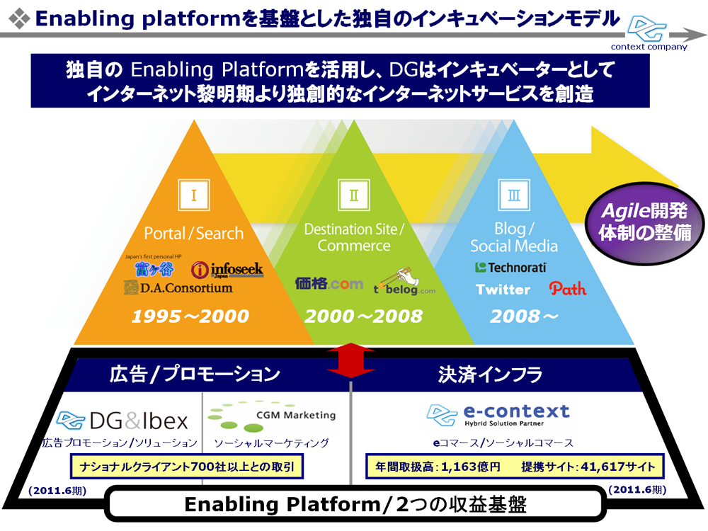 2000年に立ち上げたイーコンテクストによって始めたDGの決済インフラ事業は、広告/プロモーション事業と並ぶ「Enabling Platform」として、目立たない存在ながら着実にDGの収益を支えてきました。この収益基盤をベースとしてTwitterやPathを始めとした時代の先端を行くサービスの投資・育成事業を展開することが、DGのビジネスモデルとなっています。
