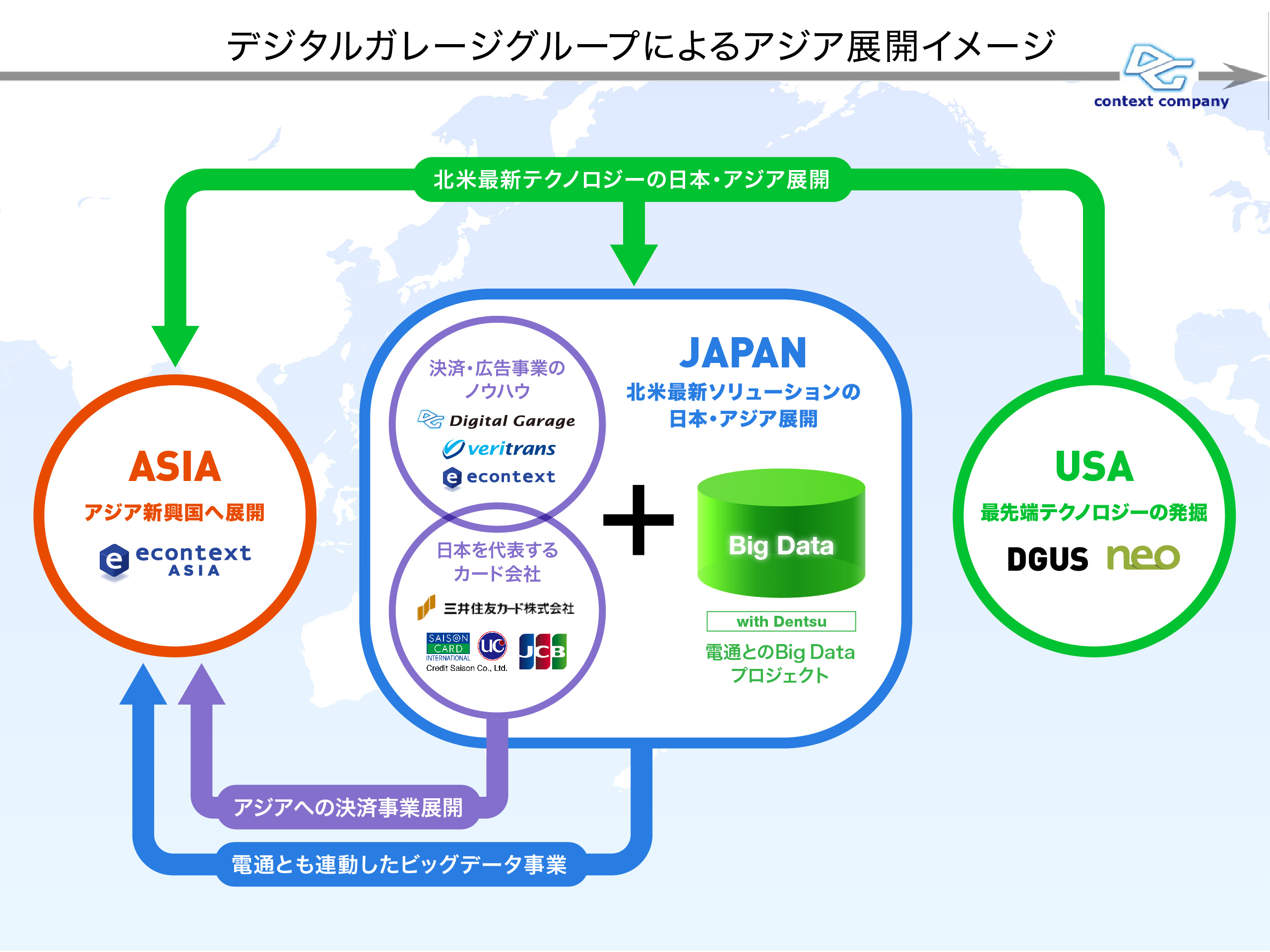 提携の二つ目の目的は、DGの有する北米を中心にしたグローバルネットワークを活用して発掘した有望なスタートアップ企業が開発する最先端の決済ソリューションや決済テクノロジーを、今回提携したクレジットカード会社3社と連携を図ることで、日本やアジア諸国に広めていくことです。