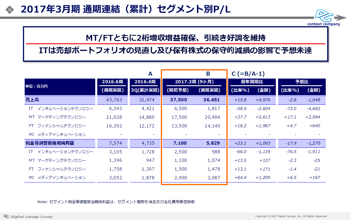 MT(マーケティングテクノロジー)セグメントは、スマートフォン/アプリ領域を中心にパフォーマンスアドが牽引し、前年同期比(便宜上2016.3期3Q累計/2017.3期3Q累計比)38%増収、同25%営業増益と高成長が続いております。FT(フィナンシャルテクノロジー)セグメントもKPIである決済取扱高が、9,955億円と前年同期比16%増加し、Eコマース市場全体を上回る成長を継続しています。主力のEコマース領域に加え、注力しているC2C領域や対面決済、公金決済においても実績が出始めています。MI(メディアインキュベーション)セグメントは、これまではカカクコム社の持分法投資利益とメディア開発を中心とした事業でしたが、2018.3期よりセグメント名をLTI(ロングタームインキュベーション)セグメントとして、本日発表したライフスタイル支援事業を担うDG Life Designや、女性誌の良質なコンテンツとソーシャルメディアを有機的に組み合わせた「コンピレーションメディア」の運営に向け講談社と合弁で設立した株式会社DK Mediaの事業が加わります。これらの事業を通じて投資育成型、アライアンス型含めた継続的な事業利益(キャッシュインフロー)を追求していきます。特にDG Life Designは、すでに黒字化している事業群をグループや戦略パートナーを挙げて投資・育成する初めてのケースとなり、IPO等で早期に事業の成長資金を調達し、より大きな事業へと成長していける事業群として大変期待しています(私が代表取締役会長に就任する予定です)。