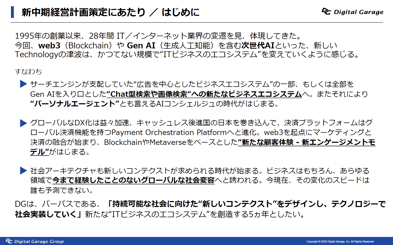 1995年の創業以来、28年間インターネット業界の変遷を見、体現してきました。web3(Blockchain)や Gen AI(生成人工知能)を含む次世代AIといった、新しいTechnologyの津波は、かつてない規模で“ITビジネスのエコシステム”を変えるように感じています。新中期経営計画策定に向けて、現在の事業環境を「新中期経営計画策定にあたり/はじめに」のスライドで表現してみました。ご一読ください。